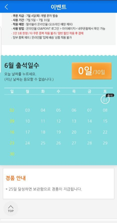 현재 매달 1달에 25일 이상 출석체크를 하면 1,000원 내외의 상품을 무료로 주고 있어요 (2019년 6월 현재)