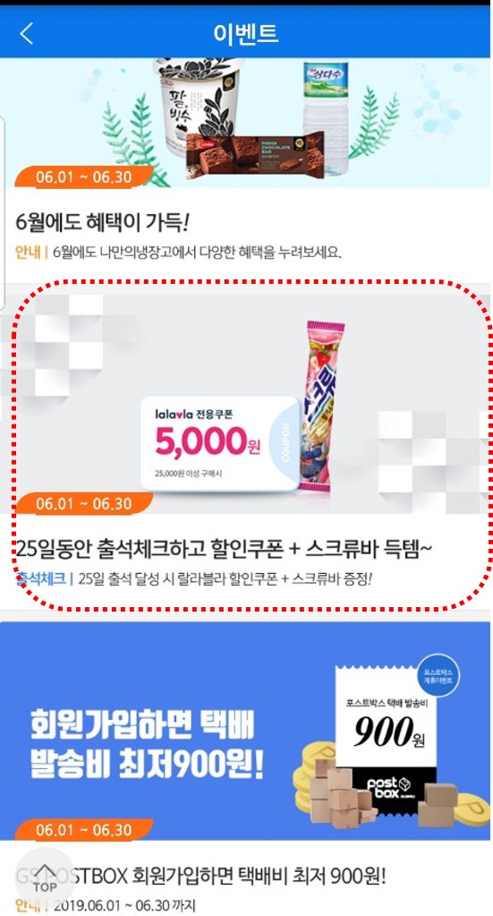 3. 이벤트에서 아래쪽으로 내려보면 출석체크라고 되어있는 빨간 점선으로 된 부분을 클릭합니다.