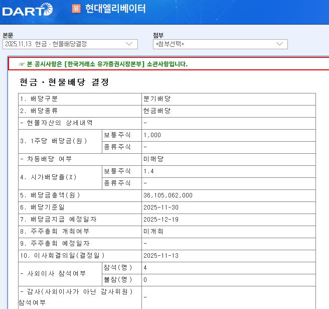 현대엘리베이터 2025년 11월 배당공시입니다.