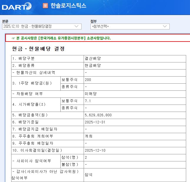 한솔로지스틱스 2025년 12월 배당공시입니다.