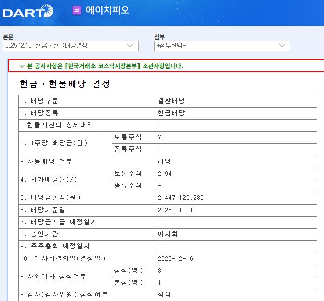 에이치피오 2026년 1월 배당공시입니다.