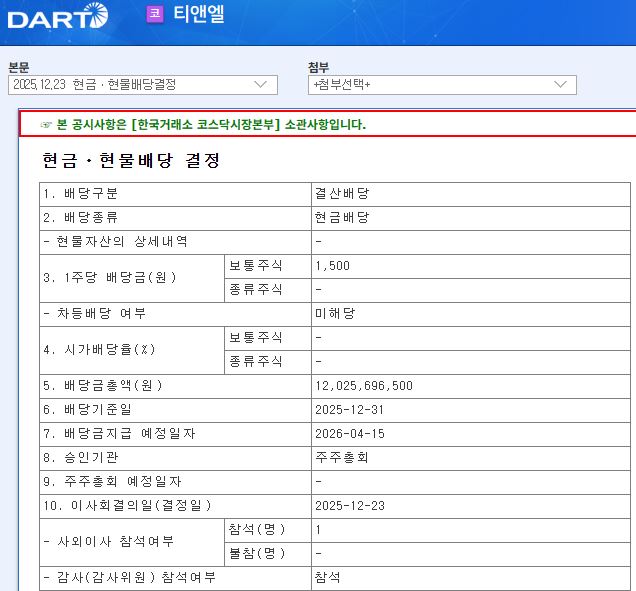 티앤엘에서 2025년 배당금을 발표했습니다.