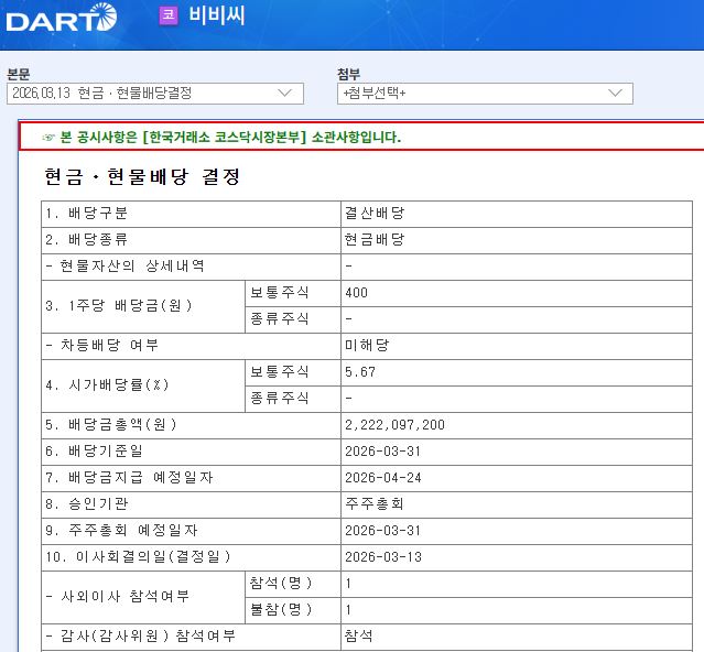 비비씨 2026년 3월 배당공시입니다.